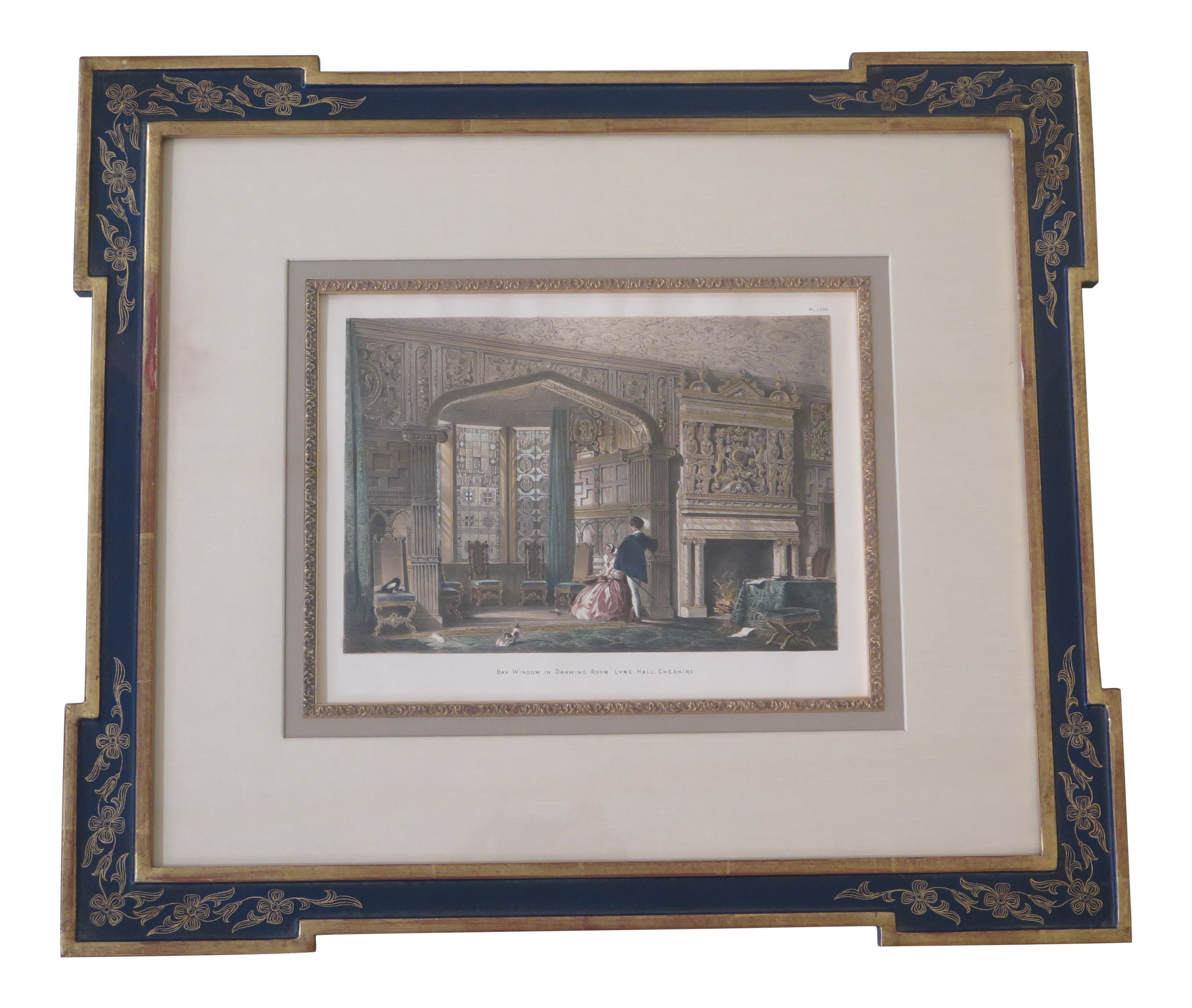 1990s Vintage English Interior Scene Engraving In Blue Frame